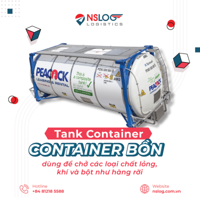 Là một loại container được thiết kế để chở các loại chất lỏng, khí và bột như hàng rời. Tank container có kết cấu gồm một bồn hình trụ bằng thép không gỉ, được giữ cố định bởi một khung kim loại có kích thước tiêu chuẩn ISO. Tank container có thể vận chuyển được nhiều loại hàng hóa khác nhau, từ các sản phẩm không nguy hiểm đến các hóa chất độc hại.